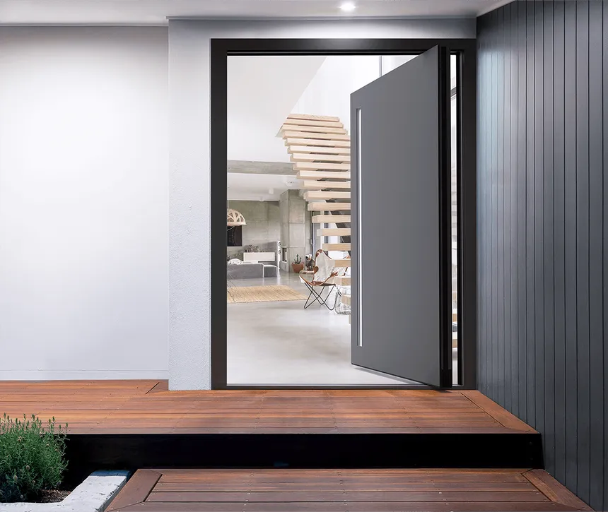 La principal diferencia es el eje de rotación. Una puerta normal cuelga de bisagras en el lateral, mientras que Pivot gira sobre pivotes en el suelo y el techo, desplazados del borde. Esto cambia la trayectoria del movimiento: parte de la hoja "entra" hacia dentro y la parte principal hacia fuera, creando un paso amplio y espectacular.