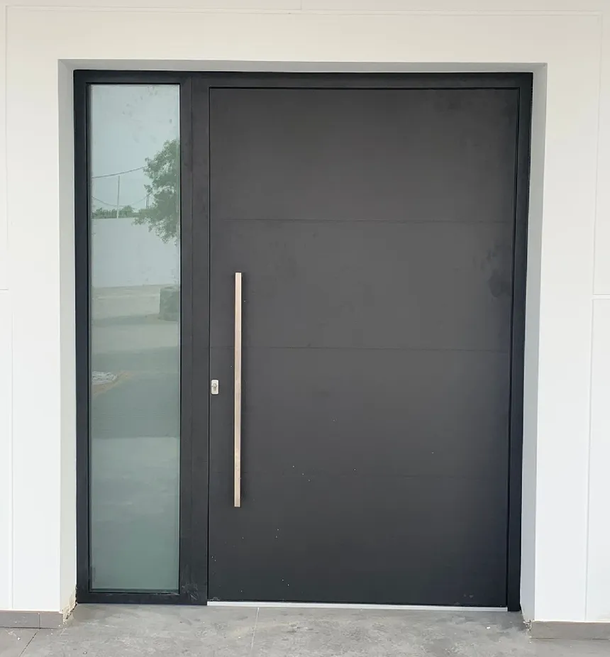 La base del sistema es un perfil potente con una profundidad de montaje de 80 mm y altos valores de aislamiento térmico, lo que la hace ideal para residencias privadas de lujo. El diseño de Millennium Pivot es un triunfo del minimalismo: posibilidad de usar manillas ocultas con iluminación LED, acabados con paneles de piedra, cerámica o aluminio, y coplanaridad total (hoja a ras del marco). Es la elección para quienes quieren impresionar a sus invitados antes incluso de que entren.