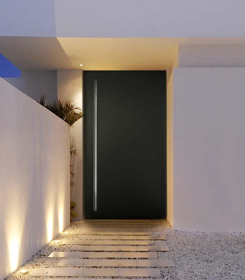 Puerta de entrada de clase premium con diseño coplanar. La hoja y el marco están en el mismo plano, creando el efecto de una superficie monolítica. Solución ideal para entradas principales de chalets y edificios comerciales.