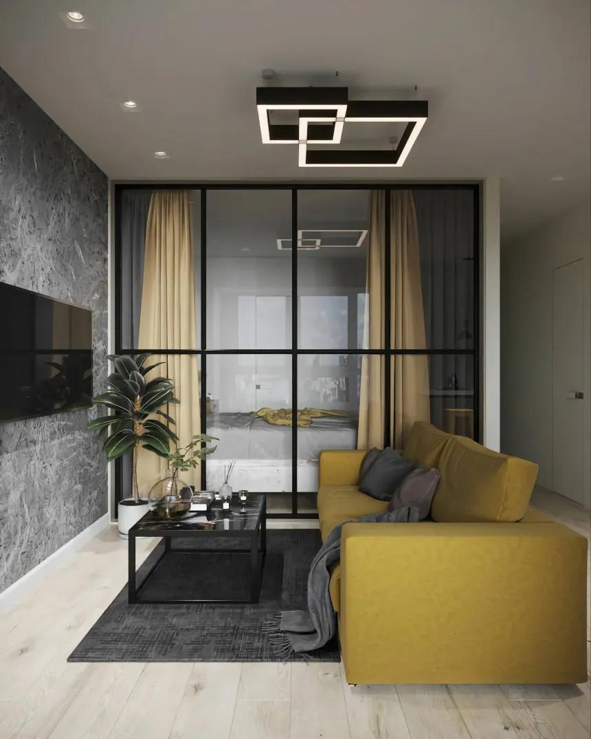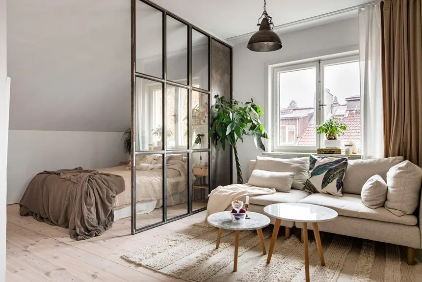 Зонирование комнаты с помощью перегородки создает особый легкий дизайн помещения без тяжелых загромождений.