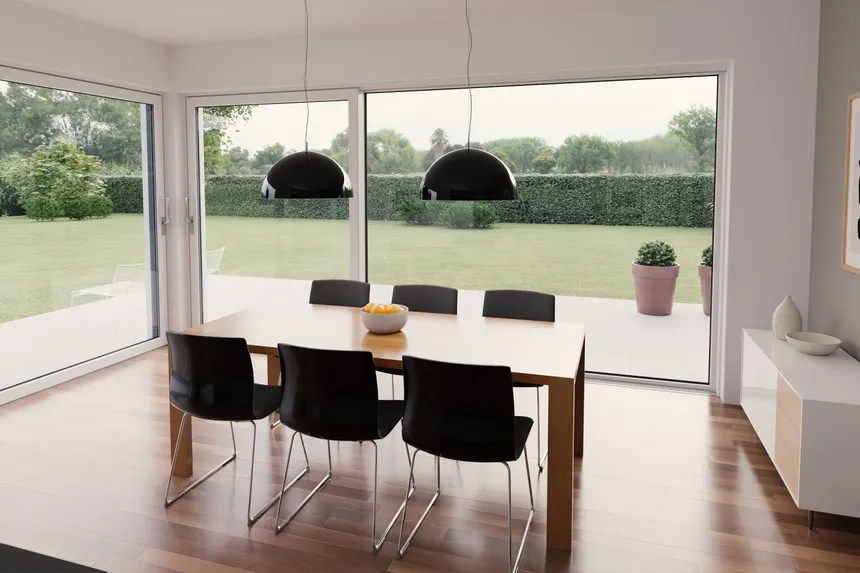 Veka Vekamotion 82 MAX — это эволюция подъемно-раздвижных систем, созданная для самой взыскательной современной архитектуры. В этой модификации инженеры Veka реализовали концепцию «исчезающей рамы». Уникальная конструкция профиля глухой (неподвижной) части позволяет практически полностью скрыть пластиковую раму в пол и боковые откосы. В результате вы видите только стекло, от самого пола до потолка, без массивных пластиковых переплетов, привычных для стандартных HS-порталов.